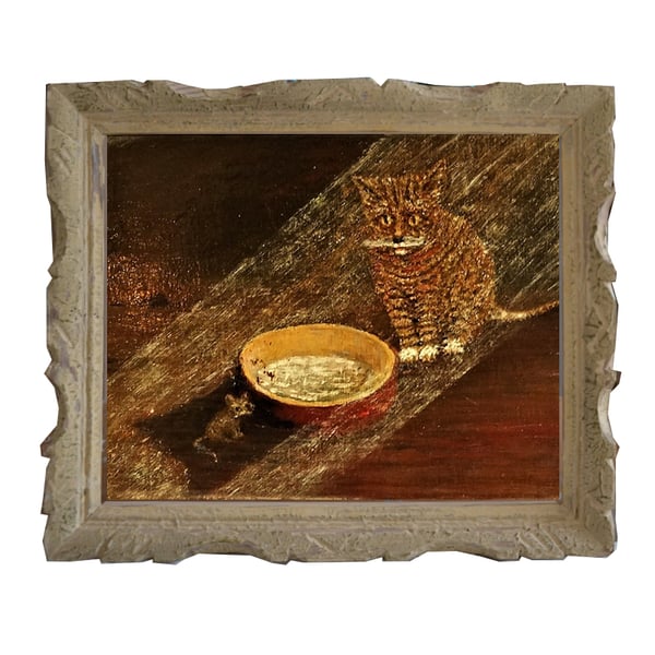 Early 20thc Naive Swedish Oil Painting, 'Cat and Mouse'