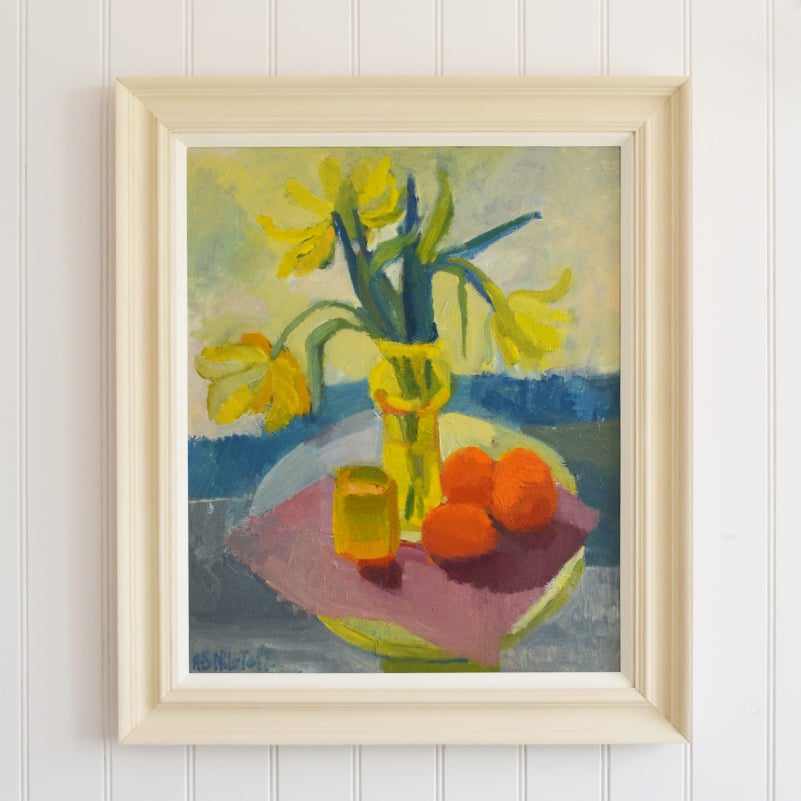 Large, still life by Swedish artist Anna-Stina Lorentze Nilstoft. Painted circa 1958 this vibrant oil on board depicts a lemon Holmegaard vase full of golden tulips. Three bright oranges huddle stage right on a berry coloured cloth. Sumptuous painting technique with lavish confident strokes. A wonderful pop of colour for a minimal space.